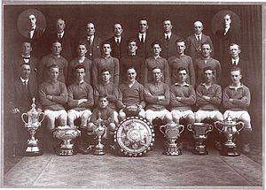 In 1910, team captain Bob Milne left the club with a legacy as one of Linfield's best ever players. He had amassed nine Irish Cups, eight league titles, and had earned 27 international caps for the Ireland national team during his time at the club.[11] Another Scottish player, Marshall McEwan, joined the club in 1911 at the age of 26.[11] He had previously played for English clubs Blackpool, Bolton Wanderers and Chelsea. McEwan is perhaps best remembered for his performance in the 1913 Irish Cup final, described by some fans as the best in years.[11] McEwan retired in 1916, but remained in Belfast and later opened several businesses in the city.[11] In 1915, the Irish League was suspended as a result of the First World War. In its place, a temporary unofficial league known as the Belfast & District League was set up and ran for four seasons until the return of the Irish League in 1919. As this was an unofficial competition, any titles during this time are not counted as Irish League Championships.[12] Linfield won this competition twice, in 1915–16 along with the Irish Cup, and in 1917–18.