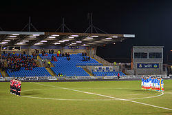 In December 2013, three months after the work was originally scheduled to begin, the redevelopment was finally given the green light. The sports minister signed off on £31 million to complete the project. The redevelopment finally got under way on 6 May 2014 after the 2013–14 domestic season had finished, eight months later than originally planned.[60] On 31 March 2015, the West Stand of the stadium was sealed off after cracks in the structure were discovered. Construction work related to the stadium redevelopment had been ongoing behind the stand in the weeks prior to the damage, but it was not known if that was directly related.[61] Originally planned for refurbishment as part of the redevelopment, the West Stand was demolished and rebuilt.[62] The redevelopment was completed in October 2016,[63] with an official capacity of 18,614.
