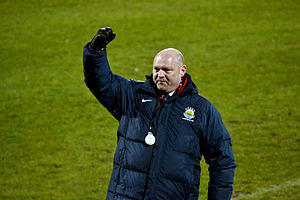 Jeffrey took charge of the team in a caretaker capacity for a league match against Portadown that afternoon, and remained as caretaker manager for the following match against Ballyclare Comrades in the Floodlit Cup on 7 January. He was officially appointed as manager on a permanent basis on 8 January 1997.[22] In his first full season in charge he led the club to three trophies – the League Cup, County Antrim Shield, and Floodlit Cup – and narrowly missed out on the league title to champions Cliftonville by four points. Jeffrey won his first league title as manager in the 1999–2000 season however, along with a third consecutive League Cup triumph. The Blues retained the league title the following season, and also won the Charity Shield and the County Antrim Shield. The 2001–02 season saw the club win a cup double, lifting both the Irish Cup and the League Cup. In 2005, the inauguration of the Setanta Cup meant the return of an all-Ireland cup competition for the first time since 1980. The Blues qualified as league champions, but started the competition poorly – losing 2–1 away to Longford Town. However, they recovered to eventually reach the final against Shelbourne, and although the Blues were major underdogs going into the match against professional League of Ireland opposition, they overcame the odds with a 2-0 scoreline to become inaugural winners of the competition.[23] Incidentally, Linfield were in fact the reigning all-Ireland champions at the time, having won the final staging of the Tyler Cup in 1980 before the competition was discontinued.