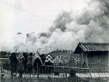On 1 March 1939, Warehouse No. 15 of the Imperial Japanese Army's Kinya ammunition dump in Hirakata, Osaka Prefecture, Japan, suffered a catastrophic explosion, the sound of which could be heard throughout the Keihan area. Additional explosions followed over the next few days as the depot burned, for a total of 29 explosions by 3 March. Japanese officials reported that 94 people died, 604 were injured, and 821 houses were damaged, with 4,425 households in all suffering the effects of the explosions.[34][35]