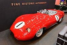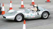 Beginning in 1954, company manager and racing driver Brian Lister brought out the first in a series of sports cars from a Cambridge iron works. Inspired by Cooper, he used a tubular ladder chassis, de Dion rear axle and inboard drum brakes.[1] Like others, he used a tuned MG engine and stock gearbox.[2] It made its debut at the British Empire Trophy at Oulton Park in 1954, with former MG driver Archie Scott Brown at the wheel. Later, Lister swapped in a Moore-tuned Bristol two-litre engine and knockoff wire wheels in place of the MG's discs to improve performance. For the sports car race supporting the 1954 British Grand Prix at Silverstone, Scott Brown won the two-litre class and placed fifth overall behind only works Aston Martins.
