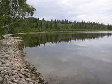 The littoral zone may form a narrow or broad fringing wetland, with extensive areas of aquatic plants sorted by their tolerance to different water depths. Typically, four zones are recognized, from higher to lower on the shore: wooded wetland, wet meadow, marsh and aquatic vegetation.[3] The relative areas of these four types depends not only on the profile of the shoreline, but upon past water levels. The area of wet meadow is particularly dependent upon past water levels;[4] in general, the area of wet meadows along lakes and rivers increases with natural water level fluctuations.[5][6] Many of the animals in lakes and rivers are dependent upon the wetlands of littoral zones, since the rooted plants provide habitat and food. Hence, a large and productive littoral zone is considered an important characteristic of a healthy lake or river.[4]