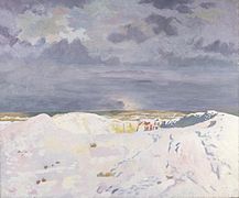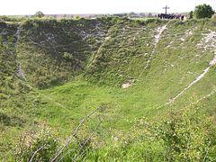 William Orpen, an official war artist, saw the mine crater in 1916 while touring the Somme battlefield, collecting subjects for paintings and described a wilderness of chalk dotted with shrapnel. John Masefield also visited the Somme, while preparing The Old Front Line (1917), in which he also described the area around the crater as dazzlingly white and painful to look at.[22] After the war the Café de la Grande Mine was built nearby; after the Second World War, many of the smaller craters were filled but the Lochnagar mine crater remained.[23] Attempts to fill it in were resisted and the land was eventually purchased by an Englishman, Richard Dunning to ensure its preservation, after he read The Old Front Line and was inspired to buy a section of the former front line.[24]
