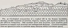 French and German military operations began on the Somme in September 1914. A German advance westwards towards Albert was stopped by the French at La Boisselle and attempts to resume offensive warfare in October failed. Both sides reduced their attacks to local operations or raids and began to fortify their remaining positions with underground works. On 18 December, the French captured the La Boisselle village cemetery at the west end of a German salient and established an advanced post only 3 m (3 yd) from the German front line. By 24 December, the French had forced the Germans back from the cemetery and the western area of La Boisselle but their advance was stopped a short distance forward at L'îlot de La Boisselle, in front of German trenches protected by barbed wire.[1] Once the location of a farm and a small number of buildings, L'îlot became known as Granathof (German, shell farm) to the Germans and later as the Glory Hole to the British. On Christmas Day 1914, French engineers sank the first mine shaft at La Boisselle.[2]