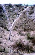 The Lochnagar mine consisted of two chambers with a shared access tunnel. The shaft was sunk in the communication trench called Lochnagar Street. After the Black Watch had arrived at La Boisselle at the end of July 1915, many fortifications, originally dug by the French, had been given Scottish names. The Lochnagar mine probably had the first deep incline shaft, which sloped from 1:2 to 1:3 to a depth of about 95 ft (29 m) see map. It was begun 300 ft (91 m) behind the British front line and 900 ft (270 m) away from the German front line. Starting from the inclined shaft, about 50 ft (15 m) below ground, a gallery was driven towards the German lines.[2] For silence, the tunnellers used bayonets with spliced handles and worked barefoot on a floor covered with sandbags. Flints were carefully prised out of the chalk and laid on the floor; if the bayonet was manipulated two-handed, an assistant caught the dislodged material. Spoil was placed in sandbags and passed hand-by-hand along a row of miners sitting on the floor and stored along the side of the tunnel, later to be used to tamp the charge.[10]