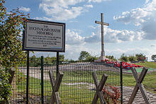 Dunning made more than 200 enquiries about land sales in the 1970s and was sold the crater.[24] The site had been used by cross-country motorbikes and for fly tipping but Dunning erected a memorial cross on the rim of the crater in 1986, using reclaimed timber from a Gateshead church; the cross was struck by lightning shortly after its installation and was repaired with metal banding.[25] The site attracts about 200,000 visitors a year and there is an annual memorial service on 1 July, to commemorate the detonation of the mine and the British, French and German war dead, when poppy petals are scattered into the crater.[12][26]