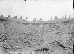 When the main attack began at 7:30 a.m., the Grimsby Chums occupied the crater and began to fortify the eastern lip, which dominated the vicinity and the advance continued to the Grüne Stellung (second position), where it was stopped by the 4th Company, which then counter-attacked and forced the British back to the crater.[14] During the day German artillery fired into Sausage Valley and in the afternoon began systematically to shell areas and then fire bursts of machine-gun fire to catch anyone who moved. German artillery also began to bombard the crater, where wounded and lost men sought shelter, particularly those from Sausage Valley to the south of the village. British artillery began to fire on the crater, which led to shell bursts on both slopes, leaving the men inside with nowhere to hide. A British aircraft flew low overhead and a soldier waved a dead man's shirt, at which the aeroplane flew away and the British shelling stopped.[15]