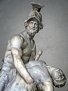 The group Menelaus supporting the body of Patroclus, discovered in Rome stood originally at the southern end of the Ponte Vecchio. There is another version of this much-restored Roman marble in the Palazzo Pitti. It is an ancient Roman sculpture from the Flavian era, copied from a Hellenistic Pergamene original of the mid third century BC. This marble group was discovered in Rome. It has undergone restorations by Ludovico Salvetti, to a model by Pietro Tacca (1640) and by Stefano Ricci (about 1830).