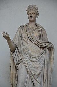 On the back of the Loggia are five marble female statues (three are identified as Matidia, Marciana and Agrippina Minor),[7] Sabines and a statue of a barbarian prisoner Thusnelda from Roman times from the era of Trajan to Hadrian. They were discovered in Rome in 1541. The statues had been in the Medici villa at Rome since 1584 and were brought here by Pietro Leopoldo in 1789. They all have significant, modern restorations.