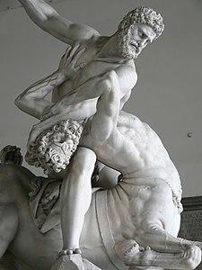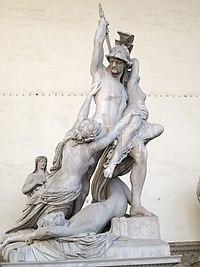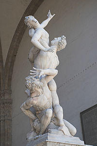 Benvenuto Cellini worked almost ten years on this bronze (1545-1554). His wax design was immediately approved by Cosimo I de' Medici. He met numerous difficulties which, according to his autobiography, almost brought him to the brink of death. The casting of this bronze statue was several times unsuccessful. When attempting again, the melting furnace got overheated, spoiling the casting of the bronze. Cellini gave orders to feed the furnace with his household furniture and finally with about 200 pewter dishes and plates, and his pots and pans. This caused the bronze to flow again. After the bronze had cooled, the statue was finished, except for three toes on the right foot. These were added later. On the far right is the manneristic group Rape of the Sabine Women by the Flemish artist Jean de Boulogne, better known by his Italianized name Giambologna.[5] This impressive work was made from one imperfect block of white marble, the largest block ever transported to Florence. The goccia model is now in the Galleria dell' Academia.[6] Giambologna wanted to create a composition with the figura serpentina, an upward snakelike spiral movement to be examined from all sides. This is the first group representing more than a single figure in European sculptural history to be conceived without a dominant viewpoint. It can be equally admired from all sides. The marble pedestal, also by Giambologna, represents bronze bas-reliefs with the same theme. This marble and bronze group is in the Loggia since 1583.