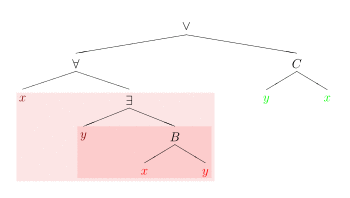 the occurrence of both x and y in C(y, x) is free, while the occurrence of x and y in B(y, x) is bound (i.e. non-free).