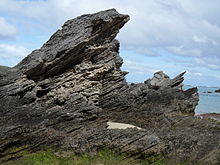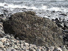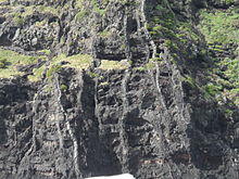 Two periods of volcanic activity produced the major features of the island. The first about 6.9 million years (Mya) ago produced the northern and central hills, while the younger and highly eroded Mount Gower and Mount Lidgbird were produced about 6.3 Mya by successive basalt (an extrusive igneous rock) lava flows that once filled a large volcanic caldera (crater)[101] and can now be seen as horizontal basalt strata on mountain cliffs (at Malabar and Mount Gower) occasionally interspersed with dikes (vertical lava intrusions).[102][103] Geological pyroclastic remnants of volcanic eruption can be seen on the 15 ha (37-acre) Roach Island (where the oldest rocks occur) and Boat Harbour as tuff (ash), breccia (with angular blocks), and agglomerate (rounded 'bombs').[14] Offshore on the Lord Howe Rise, water depths reach 2,000 m (6,600 ft) falling to 4,000 m (13,000 ft) to the west of the rise. From the dimensions of the rock on which the island stands, the island has been calculated to erode to 1/40th of its original size.[104]