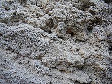 Rocks and land at the foot of these mountains is calcarenite, a coral sand, blown inland during the Pleistocene between 130,000 and 20,000 years ago and cemented into stratified layers by water percolation.[105] In this rock are fossils of bird bones and eggs, land and marine snails, and the extinct endemic horned turtle (Meiolania platyceps) now thought to be an ancient relictual nonswimming tortoise with relatives in South America.[106] The crescent of the island protects a coral reef] and lagoon, the barrier reef, at 31°S, is the most southerly in the world.[107] Beach sands, rather than consisting of quartz grains derived from granite, as on the mainland, are made of fragments of shell, coral, and coralline algae, together with basalt grains, and basaltic minerals such as black diopside and green olivine.[108] The lowland consists of alluvial soils.