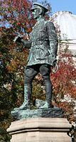 A statute of Crichton-Stuart was commissioned soon after his death.[29] Sculpted by Sir William Goscombe John, the statue was placed in Gorsedd Gardens in Cathays Park and depicts Crichton-Stuart in military uniform with binoculars in his right hand and papers in his left in a design intended to show him surveying the battlefield.[30] Ninian Road in Roath Park, one of the Bute estate developments from the early twentieth century, continues to bear his name. Ninian Park maintained its name until it was closed and demolished in 2009 following the construction of the Cardiff City's new ground, the Cardiff City Stadium, although one side of the new ground was named the Ninian Stand.[31] A housing estate was built on the site of the former ground and retained the name Ninian Park.[32] The nearby Ninian Park railway station and Ninian Park primary school also bear his name.[16] A chapel commissioned to be built on the family estate in Falkland as a memorial to Crichton-Stuart's son who died at the age of two still stands partially built after work was abandoned following Crichton-Stuart's death.[33][34]