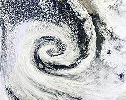 Extratropical cyclones form as waves along weather fronts due to a passing by shortwave aloft or upper-level jet streak before occluding later in their life cycle as cold-core cyclones.[15][16][17][18] Polar lows are small-scale, short-lived atmospheric low-pressure systems that occur over the ocean areas poleward of the main polar front in both the Northern and Southern Hemispheres. They are part of the larger class of mesoscale weather-systems. Polar lows can be difficult to detect using conventional weather reports and are a hazard to high-latitude operations, such as shipping and gas- and oil-platforms. They are vigorous systems that have near-surface winds of at least 17 metres per second (38 mph).[19]