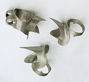 Lugged steel construction uses standard cylindrical steel tubes which are connected with lugs, external fittings made of pieces of steel (sometimes stainless steel) which fit over the ends of the tubing. Before assembly, the builder cuts the tubes to the desired length and precisely mitres[1] their ends, providing a tight fit. The end of the tubes are inserted into the lugs and subsequently brazed with a silver or brass filler metal. The lug greatly increases the strength of the joint by distributing the molten filler metal over a larger surface area via capillary action.[2] When brazing a bicycle frame, builders may use a small positioning structure called a jig[3] to hold the tubes in place and maintain their precise alignment and frame geometry.[4] Four lugs which may be used to construct a typical diamond frame include: