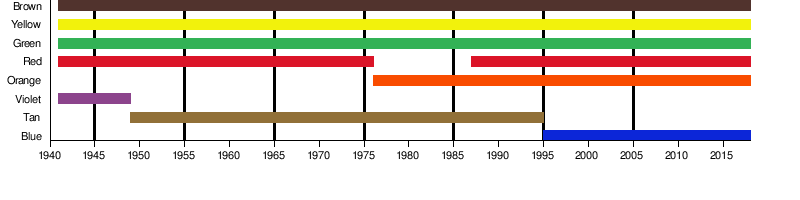 The original colors of M&M's candies were red, yellow, violet, green and brown.[57] Violet was discontinued and replaced with tan in the late 1940s.