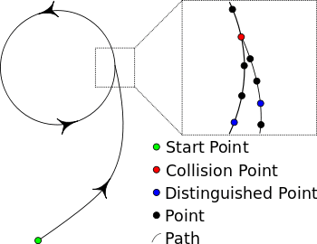 A technique called Floyd's cycle-finding algorithm was used to try to find a collision for MD5. The algorithm can be described by analogy with a random walk. Using the principle that any function with a finite number of possible outputs placed in a feedback loop will cycle, one can use a relatively small amount of memory to store outputs with particular structures and use them as "markers" to better detect when a marker has been "passed" before. These markers are called distinguished points, the point where two inputs produce the same output is called a collision point. MD5CRK considered any point whose first 32 bits were zeroes to be a distinguished point.