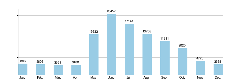 Mackenzie monthly mean discharge at Arctic Red River (m3/s)[32]