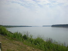 The Peace and Athabasca meet at the Peace-Athabasca Delta, a vast inland delta at the western end of Lake Athabasca, which also takes runoff from the northern third of Saskatchewan.[9] The Slave River is formed by the confluence of the two rivers and flows 415 kilometres (258 mi) due north into Great Slave Lake, at Fort Resolution, Northwest Territories. The Slave is by far the largest river flowing into the lake, with an annual flow of 108 km3 (87 million acre-feet).[10] It contributes about 77% of the overall inflow, and forms a large delta where it enters the lake.[11] Other rivers entering Great Slave Lake are the Taltson, Lockhart and Hay Rivers, the latter of which also extends into Alberta and BC.[12]