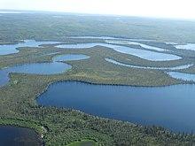 The eastern portion of the Mackenzie basin is dominated by vast reaches of lake-studded boreal forest and includes many of the largest lakes in North America. By both volume and surface area, Great Bear Lake is the biggest in the watershed and third largest on the continent, with a surface area of 31,153 km2 (12,028 sq mi) and a volume of 2,236 km3 (536 cu mi).[23] Great Slave Lake is slightly smaller, with an area of 28,568 km2 (11,030 sq mi) and containing 2,088 km3 (501 cu mi) of water, although it is significantly deeper than Great Bear.[12] The third major lake, Athabasca, is less than a third that size with an area of 7,800 km2 (3,000 sq mi).[9] Six other lakes in the watershed cover more than 1,000 km2 (390 sq mi), including the Williston Lake reservoir, the second-largest artificial lake in North America, on the Peace River.[2]