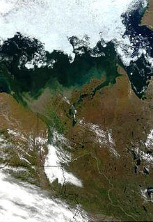 The river discharges more than 325 cubic kilometres (78 cu mi) of water each year, accounting for roughly 11% of the total river flow into the Arctic Ocean.[24][25] The river is frozen for most of the year, with the ice typically breaking up by early to mid-May in the south, and late May-early June in the north.[26] Ice breaks up earlier on the tributaries, sometimes causing ice jams and flooding where they meet the Mackenzie. In the middle of the larger lakes, such as Great Slave, ice can persist as late as mid-June. The river typically freezes by late October or November, starting in the north. Year round, the Mackenzie's outflow has a major stabilizing effect in the local climate above the Arctic Ocean with large amounts of warmer fresh water mixing with the cold seawater.[2]