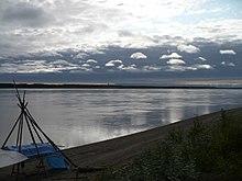 Barge traffic travels the entire length of the Mackenzie in long "trains" of up to fifteen shallow-draft vessels pulled by tugboats. Goods are shipped as far as the port of Tuktoyaktuk on the eastern end of the Mackenzie Delta, where they are transferred to oceangoing vessels and delivered to communities along Canada's Arctic coast and the numerous islands to the north.[63] In winter, the frozen channel of the Mackenzie River, especially in the delta region, is used as an ice road, firm enough to support large trucks, although travel between northern communities is mostly by dog sleds and snowmobiles.[64]