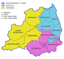 Magherafelt District Council was divided into three electoral regions; Magherafelt Town, Moyola, and Sperrin, each of which was further divided into electoral wards; six in Magherafelt Town and five in both Moyola and Sperrin.
