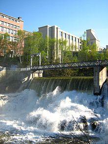 Its source, located at 208 meters (682 ft) of altitude and its confluence, being at 141 meters (463 ft) of altitude, give it a significant drop, considering its 31.8 kilometres (19.8 mi) in length. The flow of the river at its exit from Lake Memphremagog passed through a natural channel between 92 and 150 meters (490 ft) wide; the current was rapid to Seaswaninepus lake at a distance of approximately 13 kilometres (8.1 mi) downstream. This lake had a length of 8 kilometres (5.0 mi), then the great falls (Greats Falls), fell at a distance of 800 meters (2,600 ft) before the Forks (The Fork) avec la rivière St-François.[1] The region was mapped by Joseph Blanchard in 1756. The significant drop allowed the construction of seven dams, three of which in the last 1,200 metres (3,900 ft) meters, even a gorge carved out by the river, in the heart of Sherbrooke. One of them, that of the Paton Co. created the Lac des Nations, a water basin formerly intended to provide leeway during low-water periods, in order to allow the continuous functioning of industrial companies, which used the hydraulic power of the river.