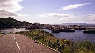 Mallaig (/ˈmælɪɡ/ ;[2] Scottish Gaelic: Malaig [ˈmal̪ˠɛkʲ] derived from Old Norse Mel Vik, meaning sand dune bay) is a port in Lochaber, on the west coast of the Highlands of Scotland. The local railway station, Mallaig, is the terminus of the West Highland railway line (Fort William and Mallaig branch) and the town is linked to Fort William by the A830 road – the "Road to the Isles".