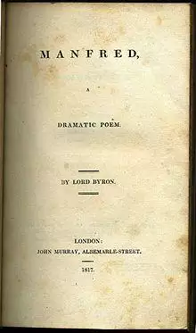 Manfred: A dramatic poem is a closet drama written in 1816–1817 by Lord Byron. It contains supernatural elements, in keeping with the popularity of the ghost story in England at the time. It is a typical example of a Gothic fiction.