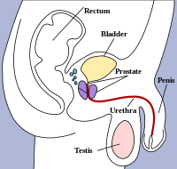 The male reproductive system includes external and internal genitalia. The male external genitalia consist of the penis, the male urethra, and the scrotum, while the male internal genitalia consist of the testes, the prostate, the epididymis, the seminal vesicle, the vas deferens, the ejaculatory duct, and the bulbourethral gland.[11]
