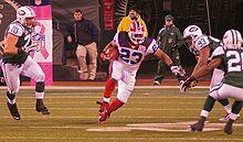 Lynch started the 2008 season with four rushing touchdowns in his first three games against the Seattle Seahawks, Jacksonville Jaguars, and Oakland Raiders.[69][70][71] He was held to a season low of 16 yards rushing in a Week 9 matchup against the New York Jets on November 2.[72] He did not break 100 yards rushing in a game until November 17 on a Monday Night Football matchup against the Cleveland Browns, when he rushed for 119. The game also marked his first receiving touchdown.[73] Two weeks later on November 30, Lynch posted a season-high 134 rushing yards against the San Francisco 49ers.[74] Lynch went over the 1,000-yard mark for the season on December 14 in a rematch against the Jets when he rushed for 127 yards.[75] He was able to stay healthy until injuring his shoulder in the second half of a Bills victory on December 21 against the Denver Broncos, during which he rushed for his eighth touchdown of the season.[76] The injury kept him out of the Bills' season finale against the New England Patriots. Lynch finished the 2008 season with 1,036 yards rushing and eight rushing touchdowns. He posted 300 receiving yards on 47 receptions, including a receiving touchdown, compared to 184 yards on 18 receptions for the 2007 season.[77] Lynch was selected to his first Pro Bowl, replacing injured Tennessee Titans running back Chris Johnson.[78] This made him the first Bills running back to head to the Pro Bowl since Travis Henry in 2002. Lynch was initially the first alternate.[79]