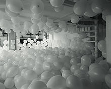 Films, installations, paintings, theatre and live-action sculptures are all characteristic of his work. Making use of whatever medium seems suitable.[7] Since 1987 he has numbered each of his works, and most of his titles are descriptive: for example Work No. 79: some Blu-tack kneaded, rolled into a ball and depressed against a wall (1993) and Work No. 88, a sheet of A4 paper crumpled into a ball (1994). Creed's work Work No. 200: Half the air in a given space (1998) is a room which has half of its cubic space filled with balloons.