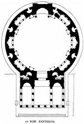 The Pantheon in Rome has survived intact, illustrating classical Roman structure, proportion, and decoration. The main structure is a dome, the apex left open as a circular oculus to let in light; it is fronted by a short colonnade with a triangular pediment. The height to the oculus and the diameter of the interior circle are the same, 43.3 metres (142 ft), so the whole interior would fit exactly within a cube, and the interior could house a sphere of the same diameter.[17] These dimensions make more sense when expressed in ancient Roman units of measurement: The dome spans 150 Roman feet[b]); the oculus is 30 Roman feet in diameter; the doorway is 40 Roman feet high.[18] The Pantheon remains the world's largest unreinforced concrete dome.[19]