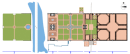 The historian of Islamic art Antonio Fernandez-Puertas suggests that the Alhambra, like the Great Mosque of Cordoba,[71] was designed using the Hispano-Muslim foot or codo of about 0.62 metres (2.0 ft). In the palace's Court of the Lions, the proportions follow a series of surds. A rectangle with sides 1 and √2 has (by Pythagoras's theorem) a diagonal of √3, which describes the right triangle made by the sides of the court; the series continues with √4 (giving a 1:2 ratio), √5 and so on. The decorative patterns are similarly proportioned, √2 generating squares inside circles and eight-pointed stars, √3 generating six-pointed stars. There is no evidence to support earlier claims that the golden ratio was used in the Alhambra.[10][72] The Court of the Lions is bracketed by the Hall of Two Sisters and the Hall of the Abencerrajes; a regular hexagon can be drawn from the centres of these two halls and the four inside corners of the Court of the Lions.[73]