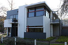 The early twentieth century movement Modern architecture, pioneered[d] by Russian Constructivism,[33] used rectilinear Euclidean (also called Cartesian) geometry. In the De Stijl movement, the horizontal and the vertical were seen as constituting the universal. The architectural form consists of putting these two directional tendencies together, using roof planes, wall planes and balconies, which either slide past or intersect each other, as in the 1924 Rietveld Schröder House by Gerrit Rietveld.[34]
