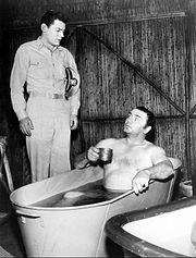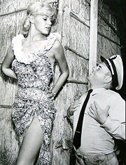 Two feature film spin-offs were based on the series: McHale's Navy (1964) and McHale's Navy Joins the Air Force (1965). The cast appeared in both films, with the exception of Borgnine and Ballantine in the latter film; Borgnine was not available due to schedule conflicts with the filming of The Flight of the Phoenix; why Ballantine was absent is not known. To beef up the crew, MacLeod, who left the series, returned for this appearance. In a Cinema Retro interview, Borgnine said Montagne wanted to make the film cheaply, without him and would not show him the script.[14] Both films were produced without laugh tracks. The sea-going PT-73 was extensively filmed running between San Pedro and Catalina Island's Avalon harbor, which stood in for the fictional town where the show was set. While both did well at the box office, the latter film was not as successful and was derided by critics as being too excessive in its use of slapstick comedy, though others praised it for satirizing of military incompetence (after a typical screw-up, the Japanese POW Fuji sighs, "Beats me how they beating us."). William Lederer, who co-authored the second film with John Fenton Murray, used scenes lifted directly from his comic novel, All the Ships at Sea. Unlike the television series, both movies were filmed in Technicolor. McHale's Navy (1964) earned an estimated $2,250,000 in North American rentals.[15] McHale's Navy Joins the Air Force took in $1,500,000.[16] In 1997, a sequel was released, starring Tom Arnold as McHale's US Naval Academy graduate son, which showed the PT-73 and its crew operating in a modern, post-World War II setting in the Caribbean. Borgnine has a cameo appearance as the senior McHale, commanding rear admiral of what appears to be the United States Naval Special Warfare Command and going by the code name "Cobra."