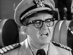 Captain Wallace "Wally" Burton Binghamton USNR (Joe Flynn)-McHale's perpetually frustrated commanding officer, referred to as "Old Leadbottom" (usually behind his back-- a nickname he received from a bullet wound to the posterior). He is a married naval reservist and his job before the war was as the commodore of a yacht club on Long Island and the editor of a yachting magazine.[7] Cantankerous and cross, Binghamton often dreams of a promotion to admiral or occasionally military glory, but is much too inept, cowardly and a bit of a goof himself (early in the series, Binghamton is a rather serious officer, but becomes goofier as the series progresses). Binghamton does come close to a promotion to Admiral Rogers' staff in "The Balloon Goes Up," but because Binghamton took too long in getting things squared away (because of McHale's crew), someone else gets the promotion. The one time Binghamton leads the PT-73 into battle, he only succeeds in "sinking" an enemy truck on land with a torpedo (a gag that was used in the Cary Grant film Operation Petticoat), based on an actual attack conducted by the USS Bowfin.[8] Binghamton is constantly trying to "get the goods" on "McHale and his pirates" to send them to prison or get them transferred and he comes close just about all the time, only to have McHale's crew get out of trouble, usually by having some kind of military success, through some form of blackmail (such as telling the admiral what really happened) or because Binghamton wants some kind of a favor from McHale. When he is not complaining about McHale and his crew to his superiors, Binghamton constantly tries to impress superior officers, VIPs or people with connections for personal gain-- which usually backfires, making him look foolish. As a running gag, Binghamton is forever being knocked down (usually by Parker or Carpenter) or covered with something messy (also usually because of Parker). Blind without his glasses, Binghamton also has his glasses knocked or taken off (to keep him from seeing something) a number of times. Occasionally, he is seen throwing darts at a picture of McHale. His catchphrases are: "What in the name of the Blue Pacific" or "What in the name of Nimitz (or Halsey)?" (as when he sees gambling or native dancing girls on McHale's Island) and "What is it, wha', wha', wha', what?!" (usually in response to McHale's "Well-a, well-a, well-a"). A running gag has a frustrated Binghamton looking up and saying, "Why me? Why is it always me?" (also used by Tinker in one episode) or "Somebody up there hates me!" His favorite catchphrase is "I could just scream!" which was once used by both McHale and Carpenter. The only time Binghamton ever gets even with the PT-73 crew is in McHale's Navy Joins the Air Force when he orders the crew under the command of Ensign Parker to jump off a dock into the water. In the pilot episode, "An Ensign for McHale," the sign outside Binghamton's office reads "Capt. R.F. Binghamton, U.S.N.R." even though his name is later established to be Wallace Burton Binghamton.