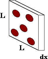 The area of the slab is L2, and its volume is L2 dx. The typical number of stopping atoms in the slab is the concentration n times the volume, i.e., n L2 dx. The probability that a beam particle will be stopped in that slab is the net area of the stopping atoms divided by the total area of the slab: