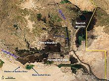 The Mesopotamian Marshes, also known as the Iraqi Marshes, are a wetland area located in Southern Iraq and Southwestern Iran.[3] Historically the marshlands, mainly composed of the separate but adjacent Central, Hawizeh and Hammar Marshes, used to be the largest wetland ecosystem of Western Eurasia. It is a rare aquatic landscape in the desert, providing habitat for the Marsh Arabs and important populations of wildlife. Draining of portions of the marshes began in the 1950s and continued through the 1970s to reclaim land for agriculture and oil exploration. However, in the late 1980s and 1990s, during the presidency of Saddam Hussein, this work was expanded and accelerated to evict Shia Muslims from the marshes. Before 2003, the marshes were drained to 10% of their original size.[4] After the fall of Hussein's regime in 2003, the marshes have partially recovered but drought along with upstream dam construction and operation in Turkey, Syria and Iran have hindered the process.[5] Since 2016 the Mesopotamian marshes have been listed as an UNESCO Heritage Site.[6]