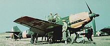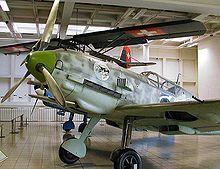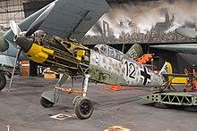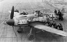 The Messerschmitt Bf 109 is a German World War II fighter aircraft that was, along with the Focke-Wulf Fw 190, the backbone of the Luftwaffe's fighter force.[3] The Bf 109 first saw operational service in 1937 during the Spanish Civil War and was still in service at the dawn of the jet age at the end of World War II in 1945.[3] It was one of the most advanced fighters when it first appeared, with an all-metal monocoque construction, a closed canopy, and retractable landing gear. It was powered by a liquid-cooled, inverted-V12 aero engine.[4] From the end of 1941, the Bf 109 was steadily supplanted by the Focke-Wulf Fw 190. It was called the Me 109 by Allied aircrew and some German aces, even though this was not the official German designation.[5]
