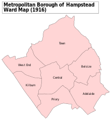 The metropolitan borough was divided into seven wards for elections: Adelaide, Belsize, Central, Kilburn, Priory, Town and West End.[8][9]