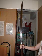 The miaodao (苗刀) is a Chinese two-handed dao or saber of the Republican Era, with a narrow blade, long hilt, and an overall length of 1.2 metres (47 in) or more. The name means "sprout saber", presumably referring to a likeness between the weapon and a newly sprouted plant. An early reference, in Jin Yiming’s Single Defense-Saber, makes a connection between the miaodao and the Qing-era wodao, as well as mentioning both single and two-handed versions of the ‘’miaodao’’, suggesting that the name originally described the shape only, without any connotations of size. While the miaodao is a recent weapon, the name has come to be applied to a variety of earlier Chinese long sabers, such as the zhanmadao and changdao. Along with the dadao, miaodao were used by some Chinese troops during the Second Sino-Japanese War.