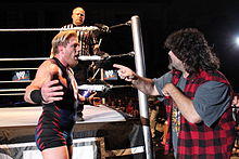 After this, Foley turned his attention away from Abyss and Dr. Stevie and concentrated on Hulk Hogan's arrival in TNA, appearing to be paranoid about Hogan taking over TNA. On the edition of December 3 of Impact! Foley teased another heel turn by booking face Kurt Angle in a handicap match, after Angle refused to give him information on who Hogan is bringing to TNA.[59] At Final Resolution, Abyss and Foley defeated Stevie and Raven in a "Foley's Funhouse" tag team match.[60] On January 4, 2010, the day of Hulk Hogan's debut for TNA, Foley was assaulted by the reunited Kevin Nash, Scott Hall and Sean Waltman, when trying to get a meeting with Hogan.[61] On the edition of January 21 of Impact! new Executive Producer Eric Bischoff fired Foley, after claiming to have been attacked by him.[62] On the edition of February 11 of Impact!, Bischoff and Foley "talked it over", as Hogan had suggested two weeks prior, and Foley was entered in the 8 Card Stud Tournament at Against All Odds.[63] The match was a No Disqualification match against Abyss, who won the match and advanced.[64] On the edition of March 15 of Impact! Bischoff announced that he would be shaving Foley bald as a punishment for trying to help Jeff Jarrett in a handicap match the previous week. At first, Foley was seemingly going along with the plan, but at the last second he shoved Mr. Socko down Bischoff's throat, put him on the barber's chair and shaved him nearly bald.[65] On the following edition of Impact!, Foley lost to Jarrett in a No Disqualification Career vs. Career match set up by Bischoff, forcing Foley to kayfabe leave TNA.[66] In reality, Foley was taken off television due to him being on his way to exceed the maximum number of dates per year on his contract, at the pace he was making appearances.[67]