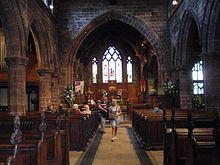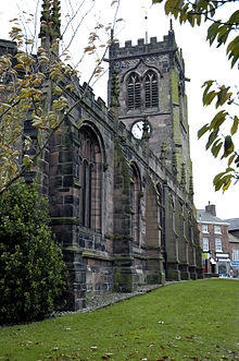 The principal landmark in Middlewich is the Anglican parish church of St Michael and All Angels, parts of which date back to the 12th century, although the majority was built during the 14th, 15th and 16th centuries. There was a general remodelling of the church during the 19th century, which included removing the whitewash from its interior to reveal the sandstone appearance seen today.[59] The church was the site of fierce fighting in the first and second Battles of Middlewich during the English Civil War.