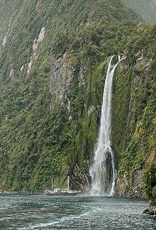 Milford Sound sports two permanent waterfalls, Lady Bowen Falls and Stirling Falls.[9] After heavy rain temporary waterfalls can be seen running down the steep sided rock faces that line the fiord. They are fed by rain water drenched moss and will last a few days at most once the rain stops.