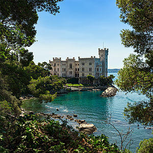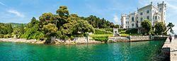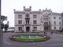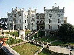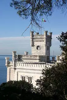 Miramare Castle (Italian: Castello di Miramare; Spanish: Castillo de Miramar; German: Schloss Miramar; Slovene: Grad Miramar) is a 19th-century castle direct on the Gulf of Trieste between Barcola and Grignano in Trieste, northeastern Italy. It was built from 1856 to 1860 for Austrian Archduke Ferdinand Maximilian and his wife, Charlotte of Belgium, later Emperor Maximilian I and Empress Carlota of Mexico, based on a design by Carl Junker.