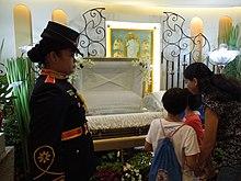 At the age of 71, Defensor Santiago died in her sleep at exactly 8:52 a.m. on 29 September 2016 while she was confined at the St. Luke's Medical Center in Taguig from lung cancer; several reports cited that Defensor Santiago died in her residence in La Vista Subdivision, Quezon City.[61][62][63] Santiago's last words according to her husband were, "I accept this. I do not want to do anything heroic."[64] While her last wish was to remain only in the memory of her own family.[65] Her body lay in state at the Cathedral Grottos of the Immaculate Conception Cathedral in Cubao the following day.[66] Following a Catholic funeral Mass, she was interred at the Loyola Memorial Park in Marikina on 2 October, beside the tomb of her son Alexander, who died in 2003.[67][68][69] Santiago's hometown, Iloilo City, declared a day of mourning for Defensor Santiago[70] and flew the Philippine flag half-mast from 29 September – 17 October 2016. The local government said in an official statement that Defensor Santiago 'brought pride and honor to all Ilonggos'.[71]
