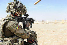 | L108A1, L110A2, L110A3 Minimi 7.62 | Light machine gun | 5.56×45 mm 7.62×51 mm | The 5.56 mm FN Minimi saw use with the Special Air Service from Operation Granby onwards,[38][39] with the shorter-barrelled FN Minimi Para being adopted as the L110A1 Light Machine Gun for regular infantry fireteams during Operation Telic. Both variants are belt-fed and equipped with a fixed, folding bipod, with the L110A1-A3 being capable of sustained suppressive fire out to 300 metres.[53] The L110A2 and L110A3 are no longer in service with regular infantry following a review of their usage in dismounted close combat infantry platoons,[54] though weapons in service with Joint Force Command users were retained.[55] | ||